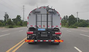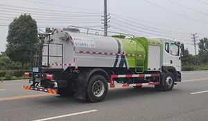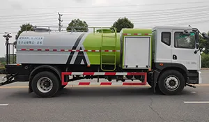 The mounted tank has a volume of 11 m³, constructed with Q235 high-quality carbon steel. The rear platform can be made of Q235 or aluminum alloy, and the side guards are Q235 steel. The water pump is rated 60–90, with fully automatic front flushing, rear sprinkling, and high-pressure cannon functions, all operable via one-button control from the driver’s cabin. The high-pressure cannon has a shooting range of over 35 meters.